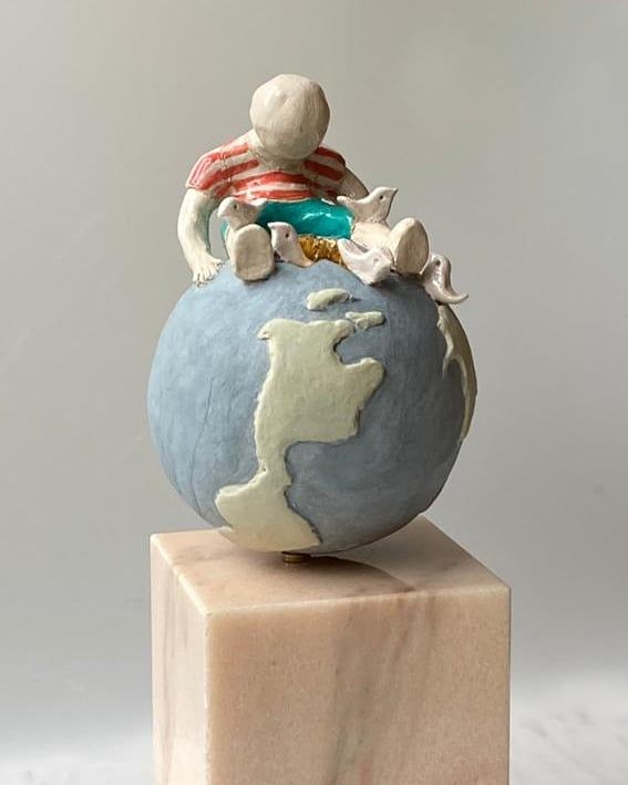 Over: Rond maart 2020 heeft Jolanda het werken met textiel herontdekt en sindsdien is zij vanuit haar achtergrond als beeldhouwer op zoek naar het ontmoetingspunt van borduurwerk en beeldhouwwerk. De visuele verhalenverteller in haar maakt dat zij zowel als beeldhouwer als in haar textielwerk geïnteresseerd is in de natuur, in mensen en hun gedrag in de samenleving. Van de stoffen die zij verzamelt, maakte zij in eerste instantie wandkleden, waarbij zij uitging van patchwork en daarop borduurde. Daarna volgden de beelden in textiel. Zij gebruikte daarvoor verschillende technieken zoals handborduren, machine borduren, foto transfers en mixed media. Door haar werk als beeldhouwer is Jolanda gewend om met harde materialen zoals keramiek en brons te werken. Met dezelfde creativiteit werkt zij nu met zachte materialen waarbij de vele mogelijkheden van expressie haar blijven fascineren. In de textielkunst werkt zij onderzoekend en is ‘al doende leert men’ haar motto. Voor haar sculpturale werk is de natuur haar grote inspiratiebron zoals in de serie ‘Mossels’. Daar geeft zij in de vorm uitdrukking aan de invloed van eb en vloed, en in de kleur aan het dag- en nachtritme van de mossel. Ook de mens is een belangrijke inspiratiebron. Eerst uitgevoerd in klei, volgden al snel figuren in beton, hout en brons. Odysseus en andere mythologische verhalen staan eveneens regelmatig centraal in haar werk zoals in de vogel-, konings- en ramsvrouwen. Haar werk is opgenomen in verschillende Nederlandse en buitenlandse collecties, waaronder particuliere verzamelingen, het Antonie van Leeuwenhoek Ziekenhuis Amsterdam, het Stadsarchief Gent (B), Chelsea and Westminster Hospital in Londen (UK) . Zij wordt vertegenwoordigd door Sille Galerie in Oudewater, Pansa Gallery in Amsterdam en Galerie De Beukenhof in Kluisbergen (België) Naast haar werk geeft Jolanda geeft online classes in ‘Photo Embroidery and Mixed Media’ en ‘how to develop a personal style” aan de New Yorkse Photo Academy Strudelmedia terwijl ze in Parijs lesgeeft bij Paris Collage Collective. Momenteel geeft ze Masterclasses Textiel in het Rietveldpaviljoen in Amersfoort.