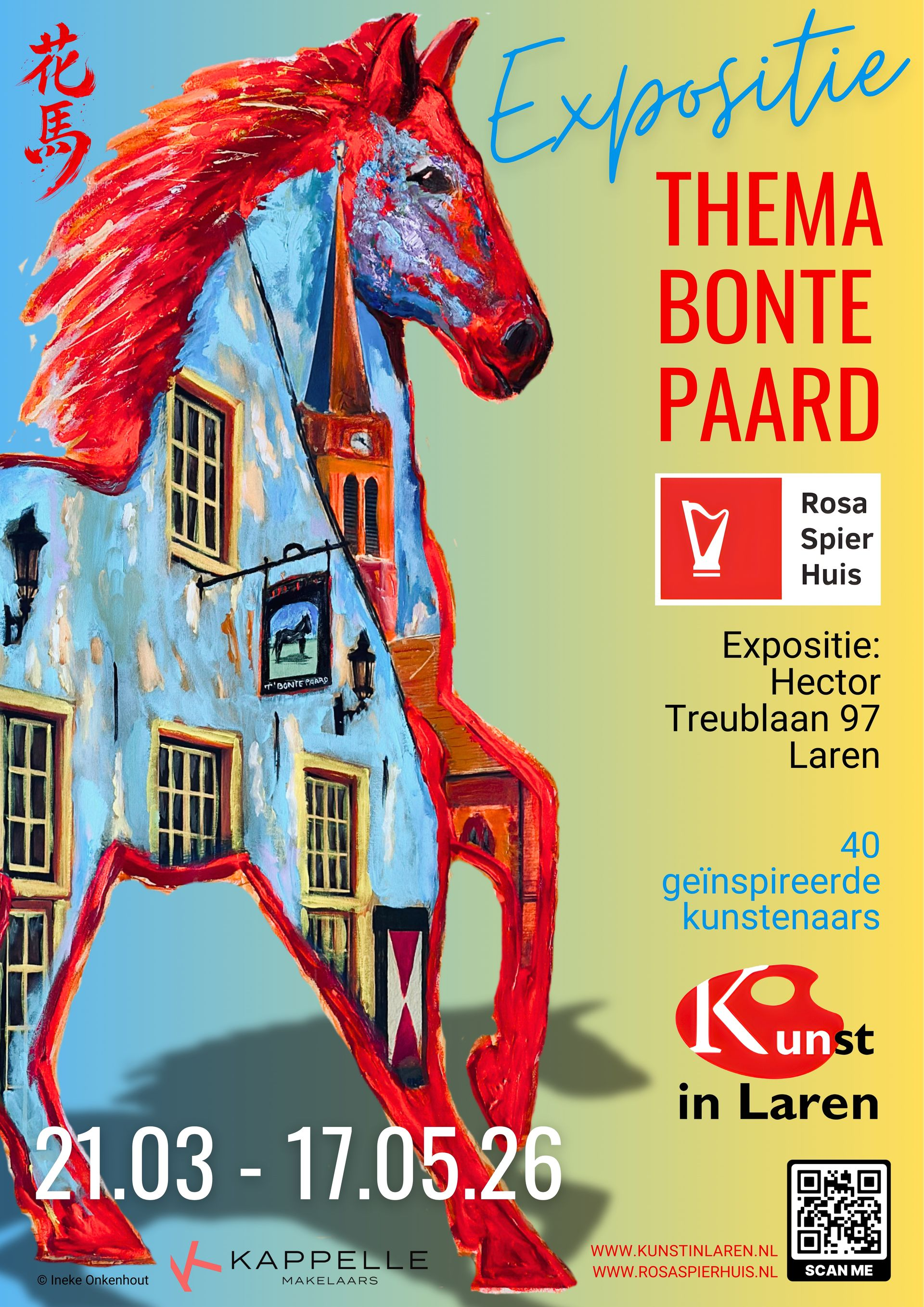 Het thema bood kunstenaars een grote vrijheid en werd vanuit alle denkbare invalshoeken benaderd: van het beroemde Larense café/restaurant ‘t Bonte Paard — wellicht de bekendste kroeg van Nederland — tot het bonte werkpaard in kleurrijke interpretatie, en zelfs het Chinese jaar van het Paard, dat in 2026 van start is gegaan. De werken variëren daarbij in stijl, techniek en temperament, van schilderkunst tot beeldhouwkunst, digital art en fotografie, textiel en gemengde technieken.