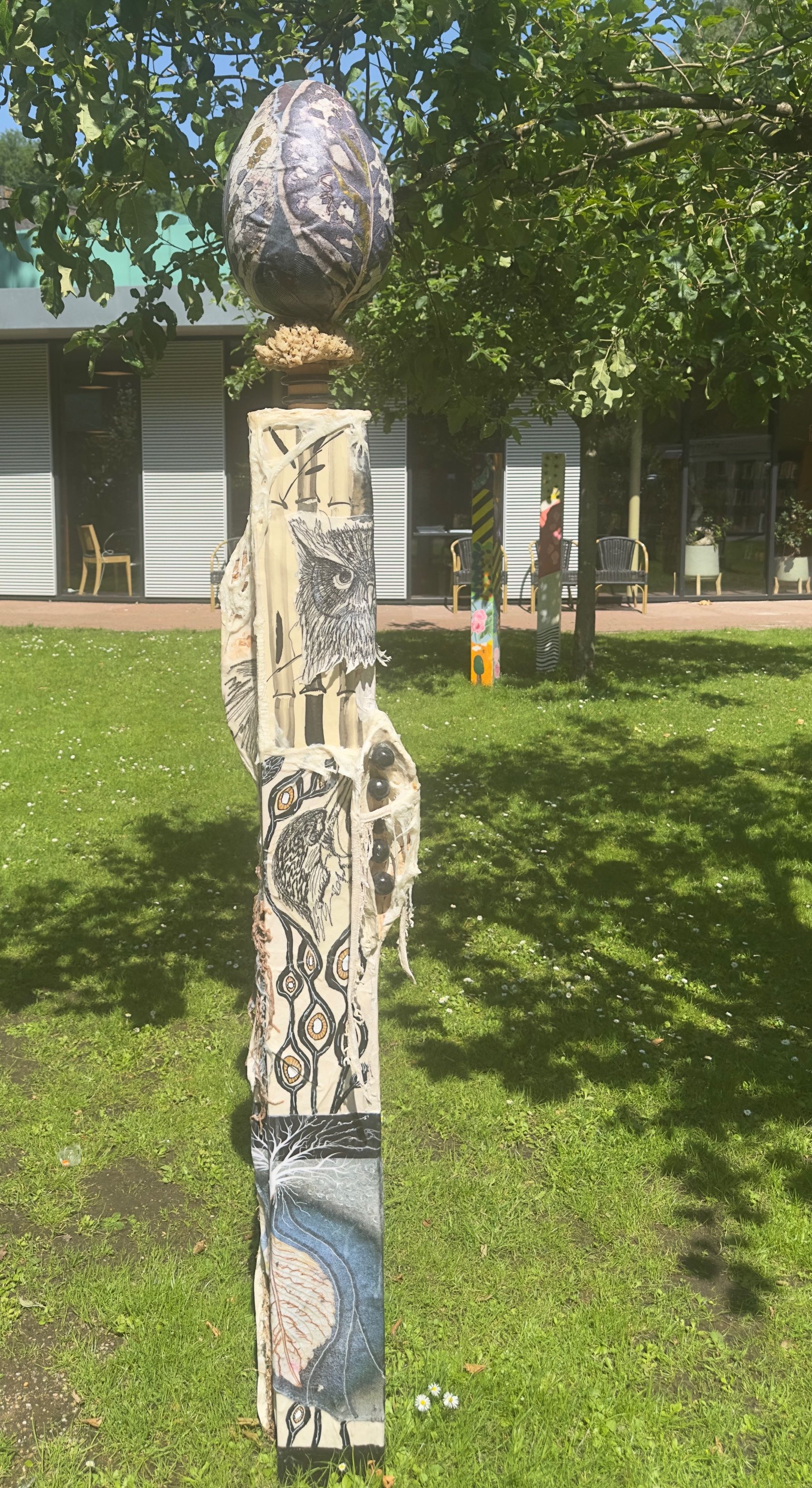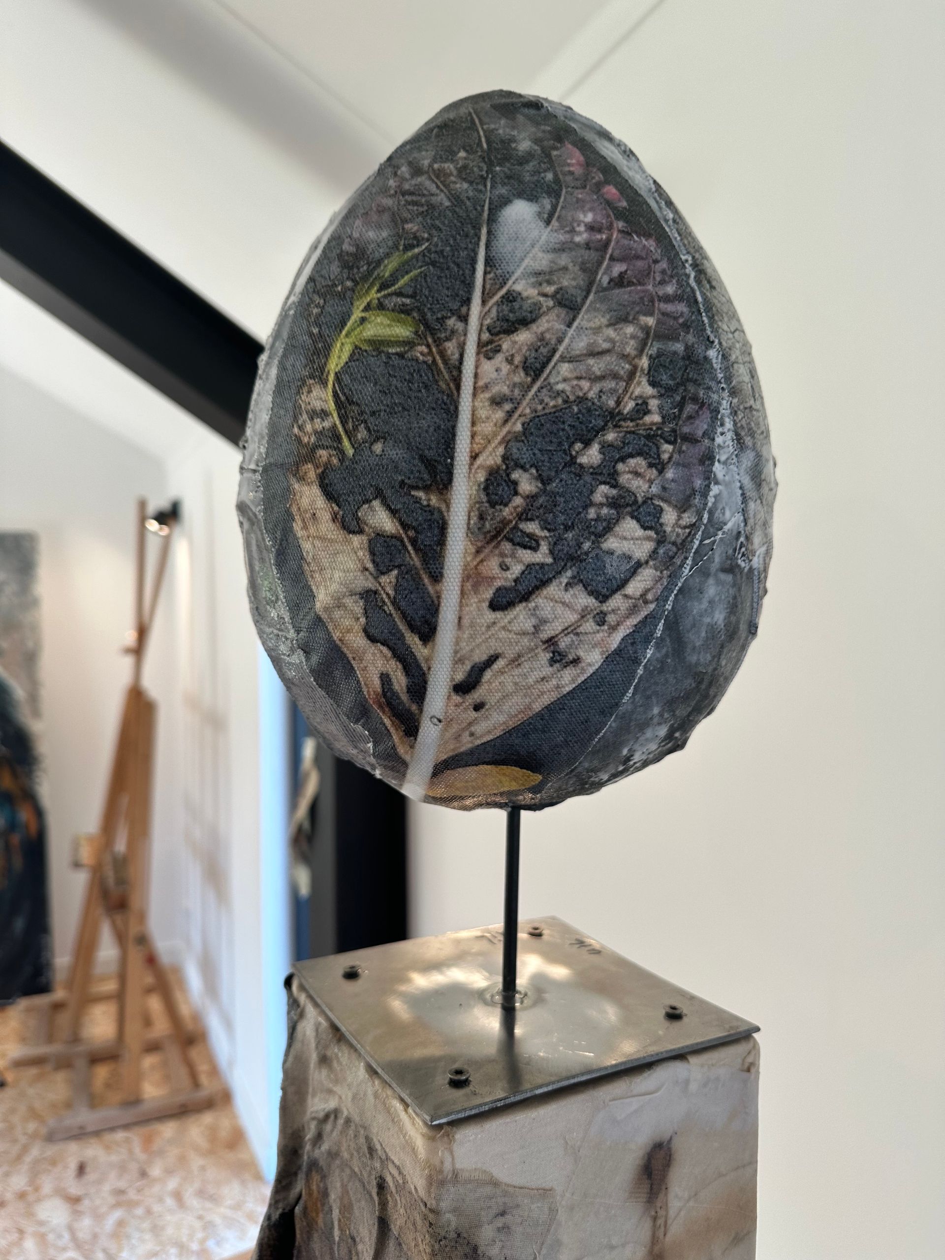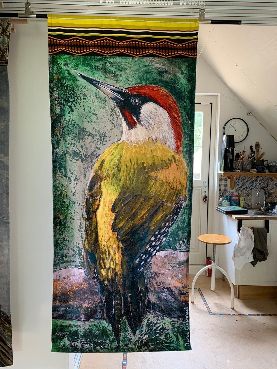 Over: Rond maart 2020 heeft Jolanda het werken met textiel herontdekt en sindsdien is zij vanuit haar achtergrond als beeldhouwer op zoek naar het ontmoetingspunt van borduurwerk en beeldhouwwerk. De visuele verhalenverteller in haar maakt dat zij zowel als beeldhouwer als in haar textielwerk geïnteresseerd is in de natuur, in mensen en hun gedrag in de samenleving. Van de stoffen die zij verzamelt, maakte zij in eerste instantie wandkleden, waarbij zij uitging van patchwork en daarop borduurde. Daarna volgden de beelden in textiel. Zij gebruikte daarvoor verschillende technieken zoals handborduren, machine borduren, foto transfers en mixed media. Door haar werk als beeldhouwer is Jolanda gewend om met harde materialen zoals keramiek en brons te werken. Met dezelfde creativiteit werkt zij nu met zachte materialen waarbij de vele mogelijkheden van expressie haar blijven fascineren. In de textielkunst werkt zij onderzoekend en is ‘al doende leert men’ haar motto. Voor haar sculpturale werk is de natuur haar grote inspiratiebron zoals in de serie ‘Mossels’. Daar geeft zij in de vorm uitdrukking aan de invloed van eb en vloed, en in de kleur aan het dag- en nachtritme van de mossel. Ook de mens is een belangrijke inspiratiebron. Eerst uitgevoerd in klei, volgden al snel figuren in beton, hout en brons. Odysseus en andere mythologische verhalen staan eveneens regelmatig centraal in haar werk zoals in de vogel-, konings- en ramsvrouwen. Haar werk is opgenomen in verschillende Nederlandse en buitenlandse collecties, waaronder particuliere verzamelingen, het Antonie van Leeuwenhoek Ziekenhuis Amsterdam, het Stadsarchief Gent (B), Chelsea and Westminster Hospital in Londen (UK) . Zij wordt vertegenwoordigd door Sille Galerie in Oudewater, Pansa Gallery in Amsterdam en Galerie De Beukenhof in Kluisbergen (België) Naast haar werk geeft Jolanda geeft online classes in ‘Photo Embroidery and Mixed Media’ en ‘how to develop a personal style” aan de New Yorkse Photo Academy Strudelmedia terwijl ze in Parijs lesgeeft bij Paris Collage Collective. Momenteel geeft ze Masterclasses Textiel in het Rietveldpaviljoen in Amersfoort.