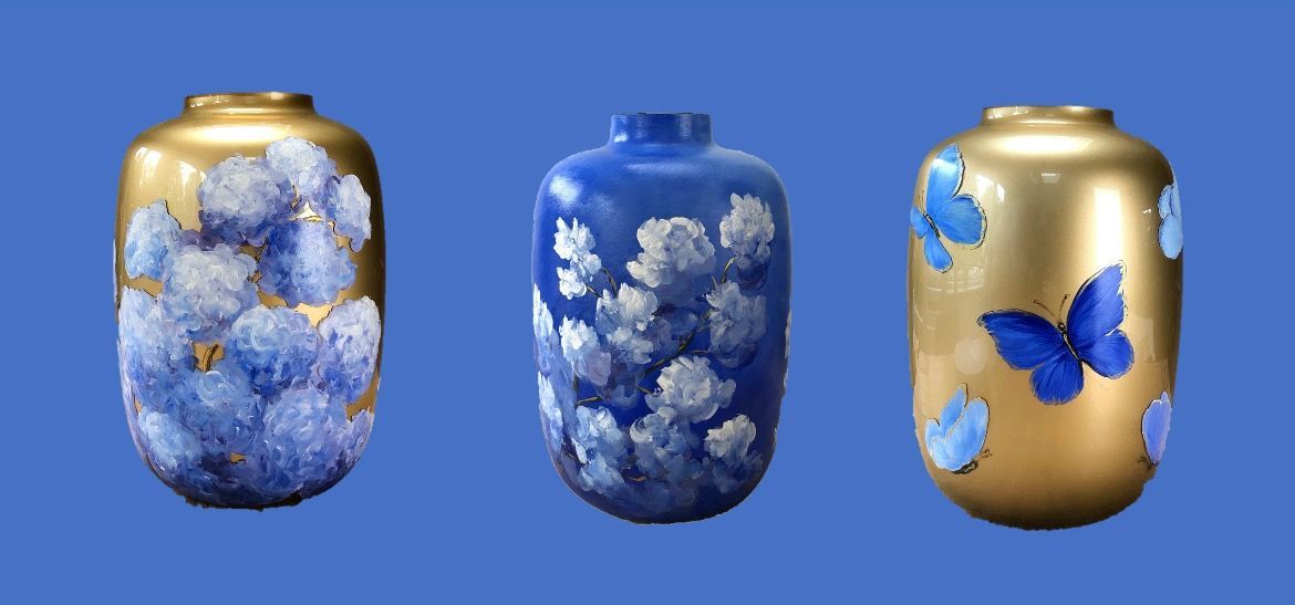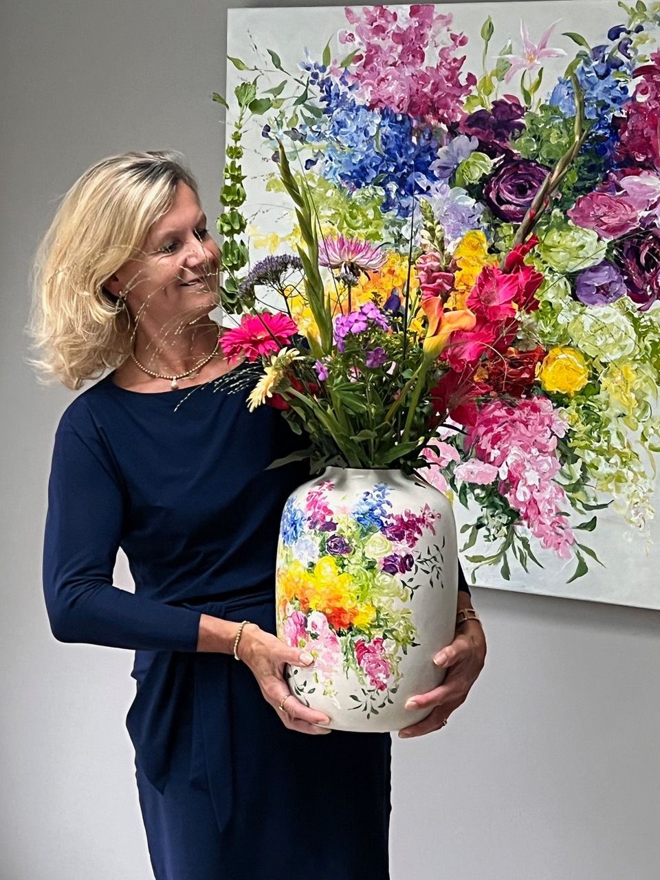 De kunstvazen zijn gebaseerd op de schildertechnieken die ik op schilderdoek toepas. Veel van mijn vazen zijn te zien en beschikbaar in de Singer Shop in Laren. Met iedere nieuwe tentoonstelling in museum Singer Laren maak ik een serie vazen waarin iets terug te vinden is van de tentoonstelling in kleur en/of onderwerp. Ook heb ik eerder een serie vazen beschilderd met eigen thema's van bloemen, vlinders en kleuren. Deze serie vazen hebben elk een meisjesnaam gekregen met de beginletters in de volgorde van het alfabet.