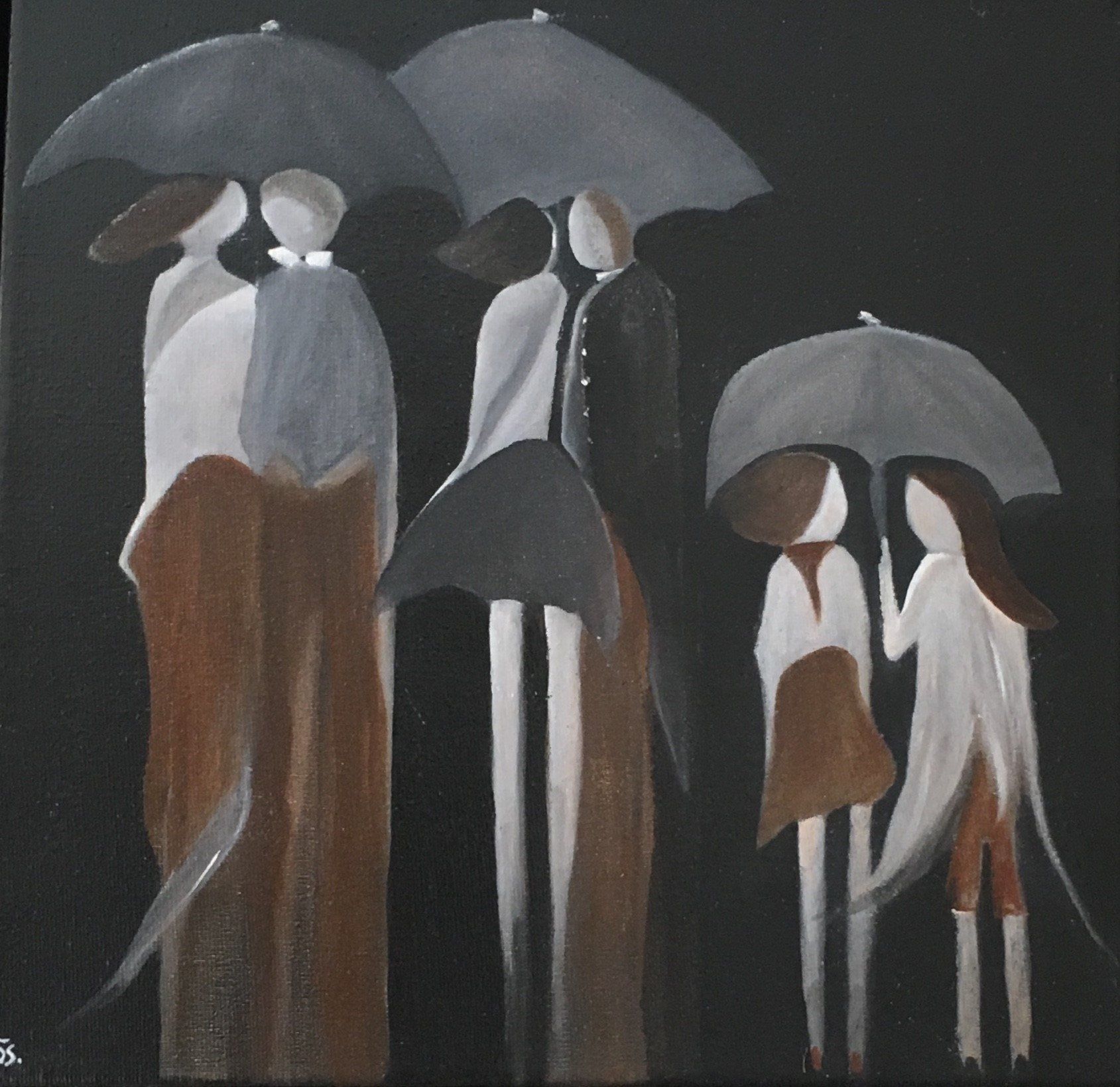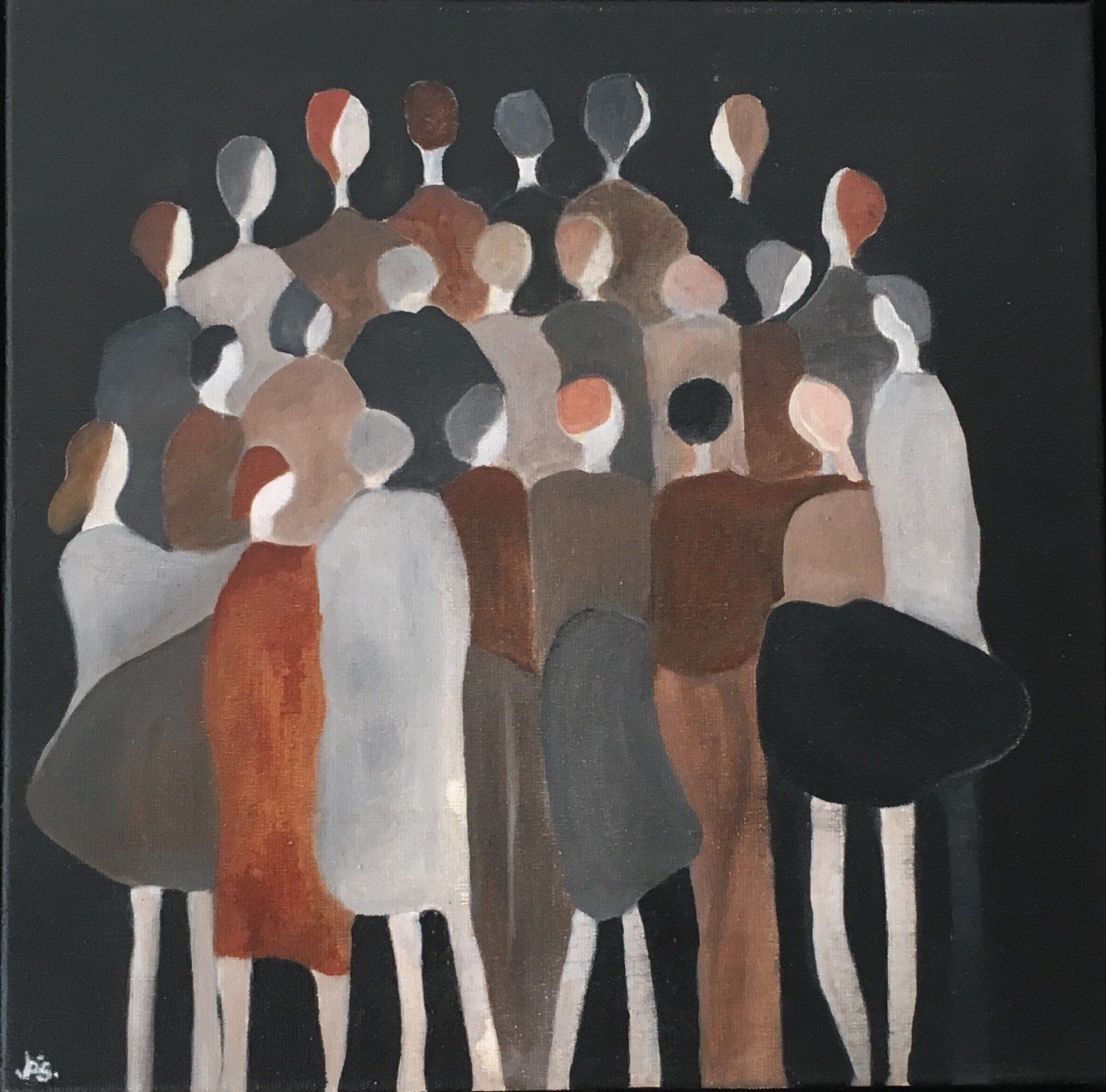 Tijdens het "ontwerpen" heeft zij totaal geen houvast, maar ook geen enkele beperking tijdens het creëren van de 'dames en heren" op het doek.