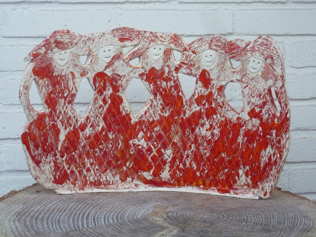 Over: Rond maart 2020 heeft Jolanda het werken met textiel herontdekt en sindsdien is zij vanuit haar achtergrond als beeldhouwer op zoek naar het ontmoetingspunt van borduurwerk en beeldhouwwerk. De visuele verhalenverteller in haar maakt dat zij zowel als beeldhouwer als in haar textielwerk geïnteresseerd is in de natuur, in mensen en hun gedrag in de samenleving. Van de stoffen die zij verzamelt, maakte zij in eerste instantie wandkleden, waarbij zij uitging van patchwork en daarop borduurde. Daarna volgden de beelden in textiel. Zij gebruikte daarvoor verschillende technieken zoals handborduren, machine borduren, foto transfers en mixed media. Door haar werk als beeldhouwer is Jolanda gewend om met harde materialen zoals keramiek en brons te werken. Met dezelfde creativiteit werkt zij nu met zachte materialen waarbij de vele mogelijkheden van expressie haar blijven fascineren. In de textielkunst werkt zij onderzoekend en is ‘al doende leert men’ haar motto. Voor haar sculpturale werk is de natuur haar grote inspiratiebron zoals in de serie ‘Mossels’. Daar geeft zij in de vorm uitdrukking aan de invloed van eb en vloed, en in de kleur aan het dag- en nachtritme van de mossel. Ook de mens is een belangrijke inspiratiebron. Eerst uitgevoerd in klei, volgden al snel figuren in beton, hout en brons. Odysseus en andere mythologische verhalen staan eveneens regelmatig centraal in haar werk zoals in de vogel-, konings- en ramsvrouwen. Haar werk is opgenomen in verschillende Nederlandse en buitenlandse collecties, waaronder particuliere verzamelingen, het Antonie van Leeuwenhoek Ziekenhuis Amsterdam, het Stadsarchief Gent (B), Chelsea and Westminster Hospital in Londen (UK) . Zij wordt vertegenwoordigd door Sille Galerie in Oudewater, Pansa Gallery in Amsterdam en Galerie De Beukenhof in Kluisbergen (België) Naast haar werk geeft Jolanda geeft online classes in ‘Photo Embroidery and Mixed Media’ en ‘how to develop a personal style” aan de New Yorkse Photo Academy Strudelmedia terwijl ze in Parijs lesgeeft bij Paris Collage Collective. Momenteel geeft ze Masterclasses Textiel in het Rietveldpaviljoen in Amersfoort.